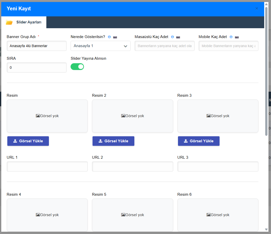 Anasayfa alanınıza birden fazla banner ekleyebilirsiniz. Bunları yanyana 2, 3, 4'lü şekilde sınırsız ekleme özelliğini kullanmak için aşağıdaki adımları uygulayınız.