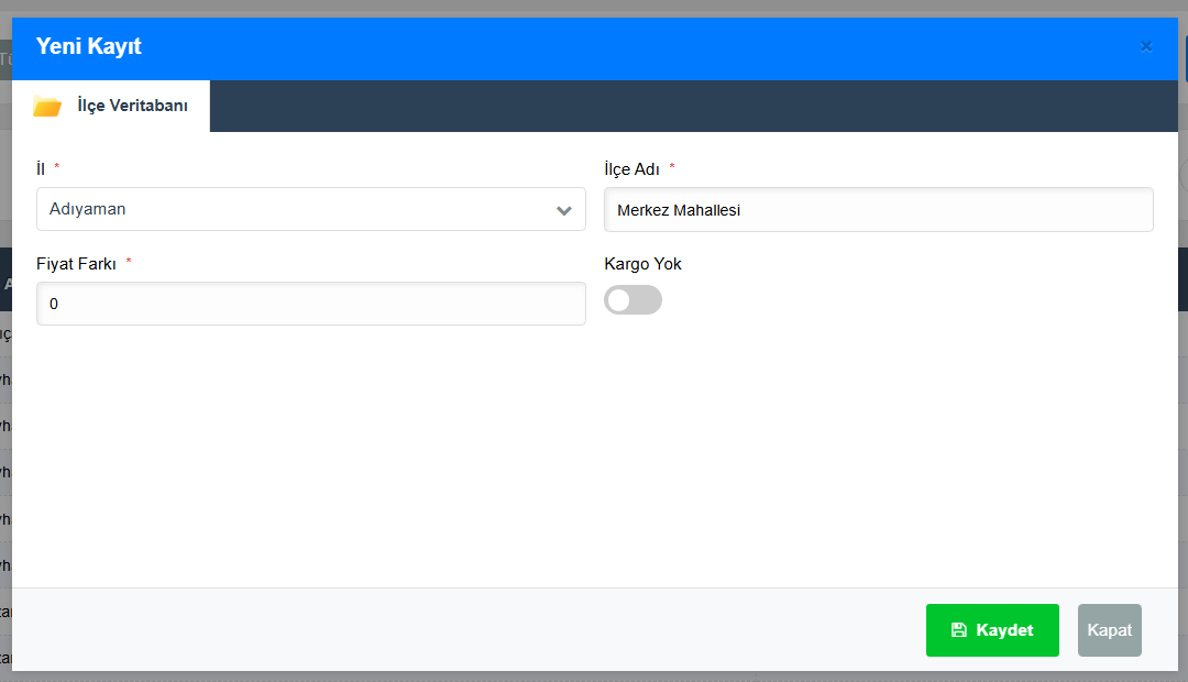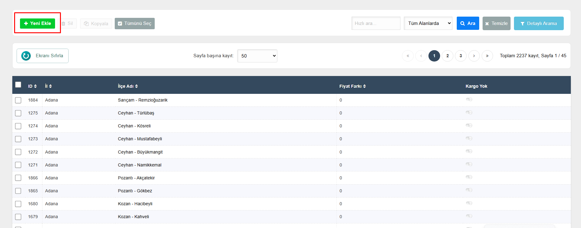 Adım 2 : Yeni Ekle butonuna tıklayıp Semt Tanmlayın
