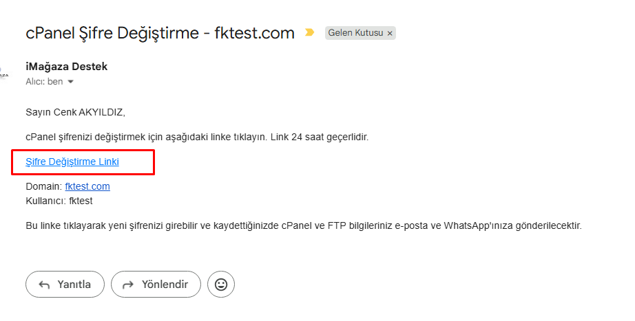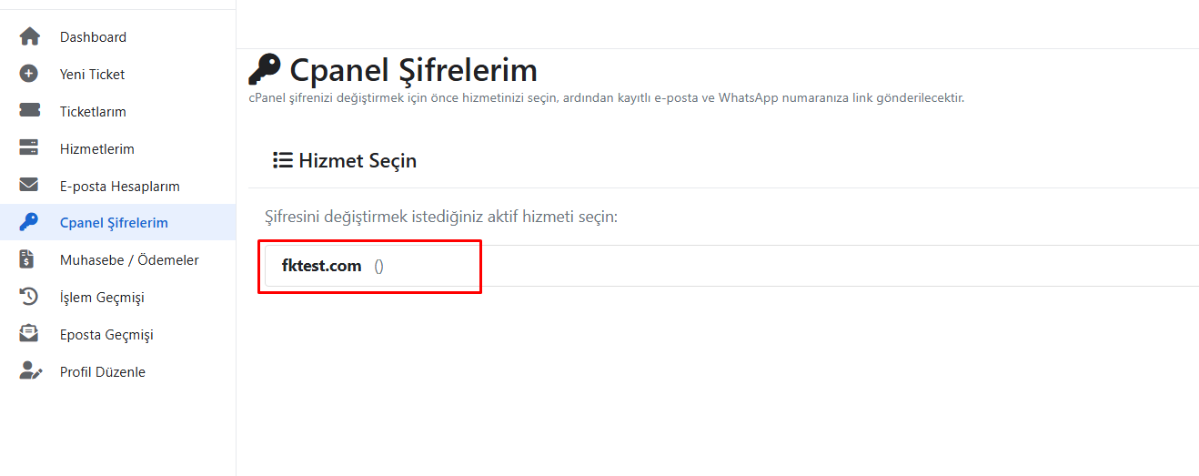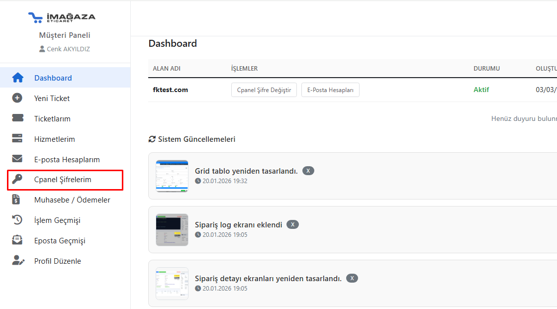 iMağaza'da direkt cpanel bilgilerinizi alabilmek için aktif bir hizmetiniz için şifreyi yeniden oluşturmanız gerekmektedir. Aşağıdaki adımları uygulayarak Cpanel / FTP şifrelerinizi sıfırlayarak Cpanel yönetiminize erişebilirsiniz.