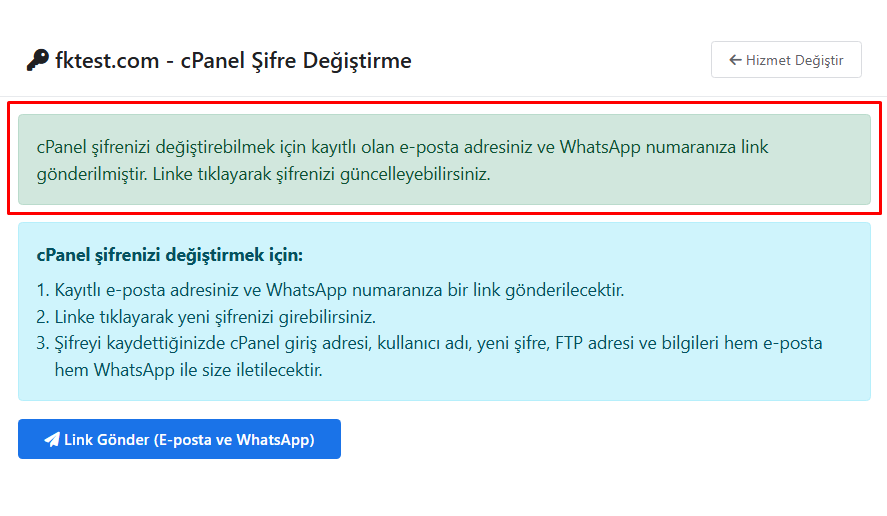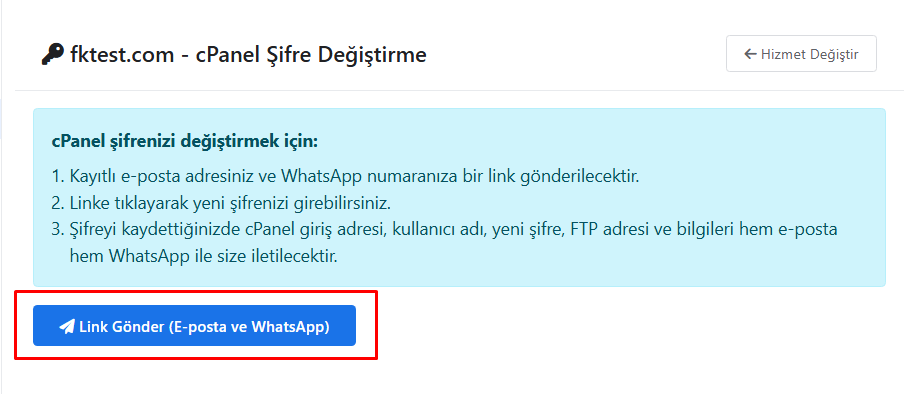 Onay ekranı geldiğinde eposta ve whatsapp adreslerinize Cpanel / FTP bilgilerinizin tamamı ıgelmiş olacaktır.