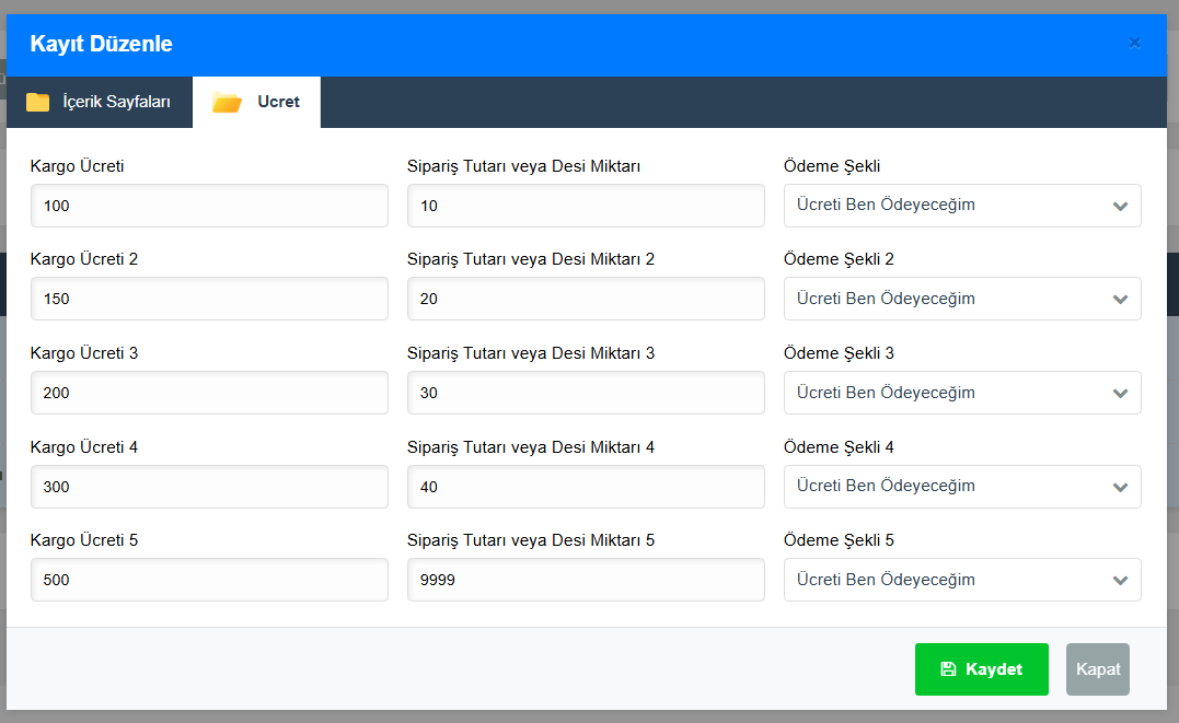 Ücret sekmesine tıkladığınızda kargolar 5 farklı basamakla ücretlendirilebilir. Bir sonraki adımda detaylar belirtilmiştir.