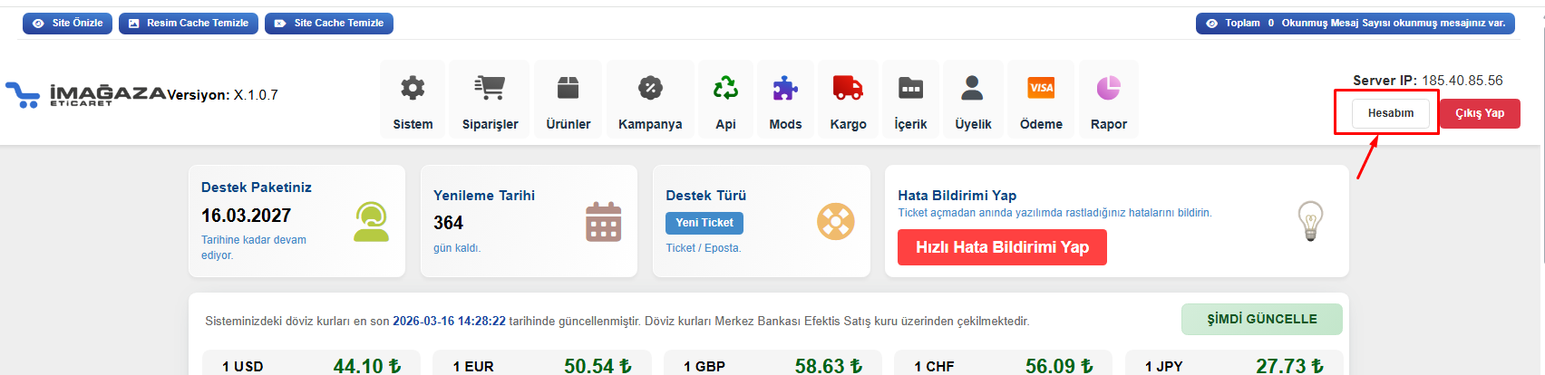 Aşağıda işaretlediğimiz "Hesabım" butonuna tıkladığınızda karşınıza yönetim bilgilerinizi değiştreceğiniz hesap çıkacaktır bu butona tıklayınız.